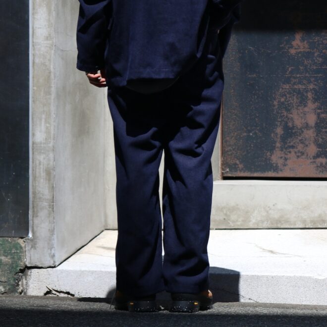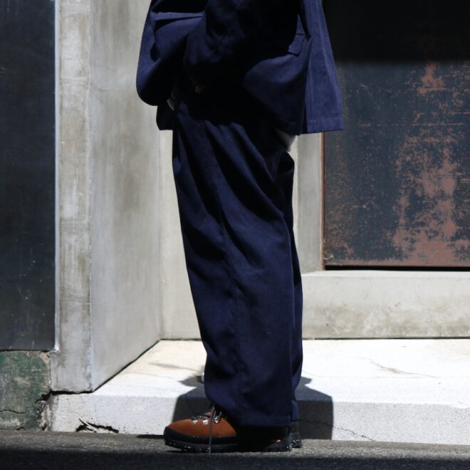 チノパン、ウールトラウザーズのようにアメリカントラディショナルスタイルの定番であるプレーンフロントトラウザーズを現代解釈で作成。