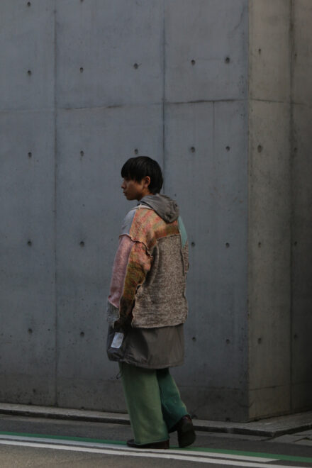 縫い代を表に出しカッティングを強調し、アシンメトリーな雰囲気を演出。
