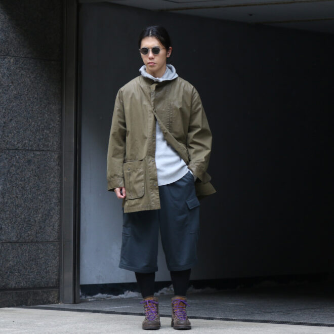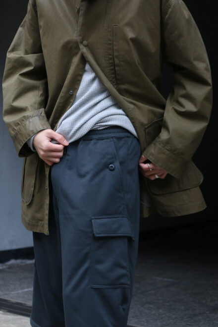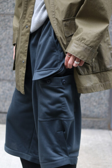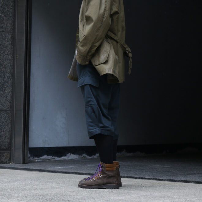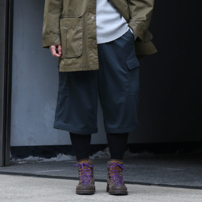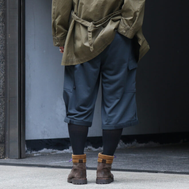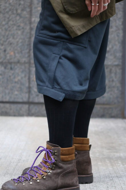 ヨーロッパミリタリーのニッカーパンツよりインスピレーションを受けデザインしたアイテムで、やや大きめにとったワタリ幅、裾をマジックテープでアジャストできるため、膝下で履くことや留めずに8分丈で着用するなどアレンジが可能となっております。