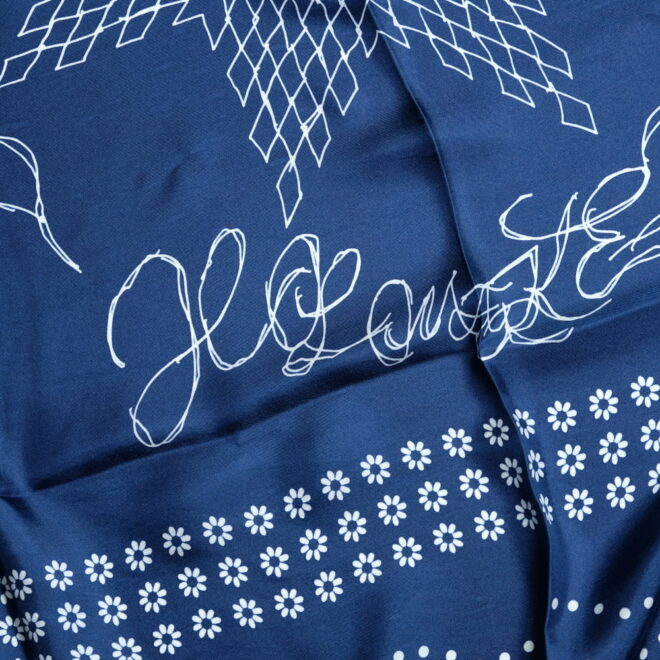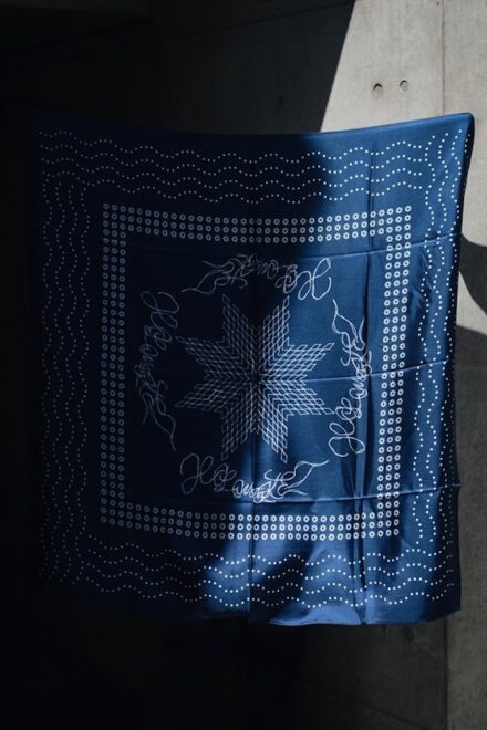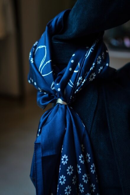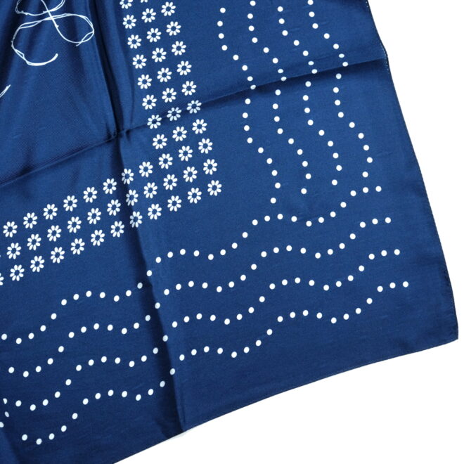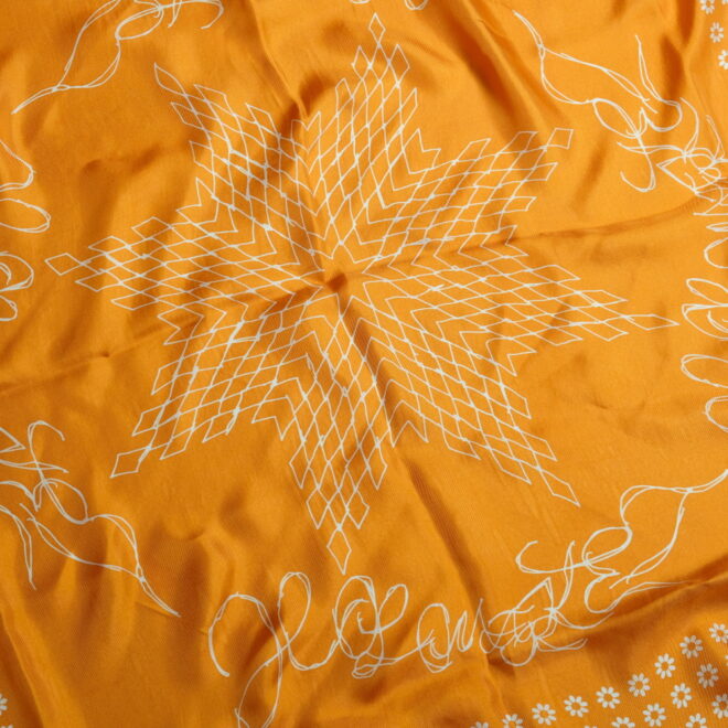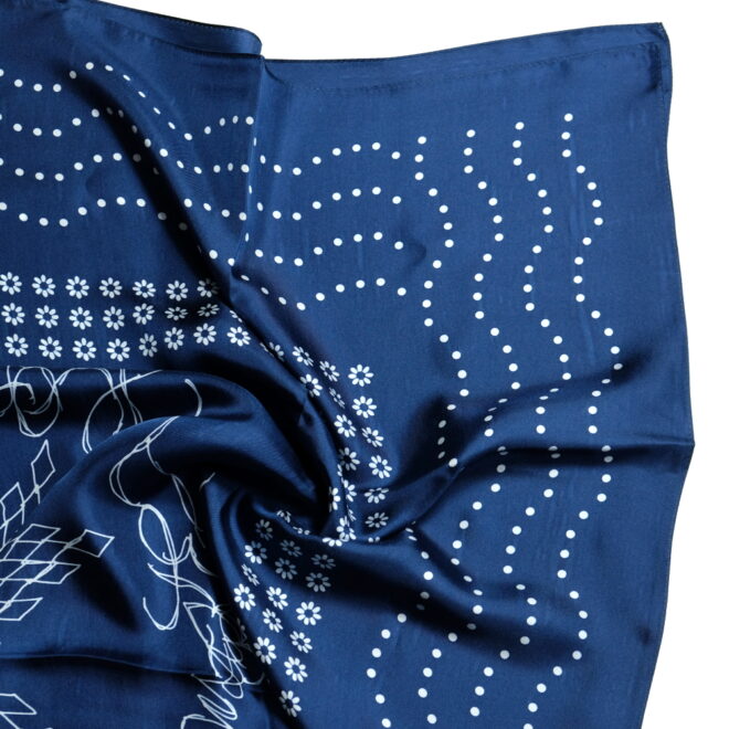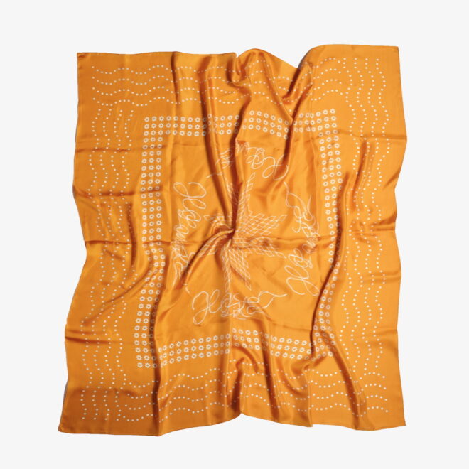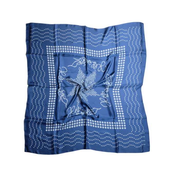 高密度の100%シルクファブリックを使用し、手捺染プリントを施したオリジナルシルクスカーフ。