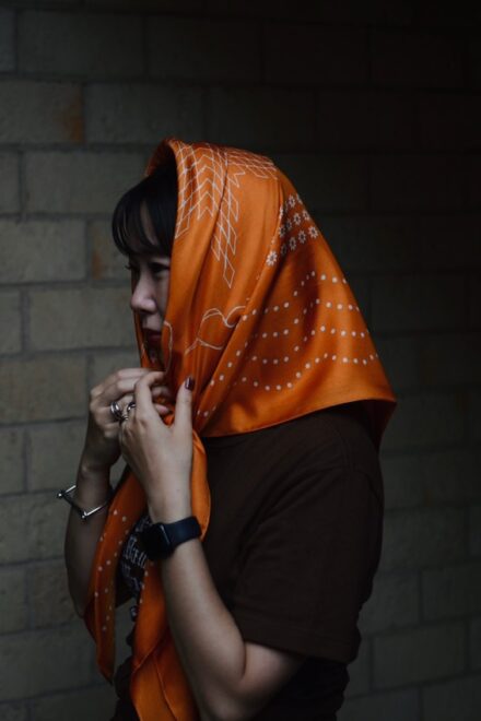 今回は縦横105cmと非常に大判なスカーフのため、よりアレンジの効くアイテムとなっております。