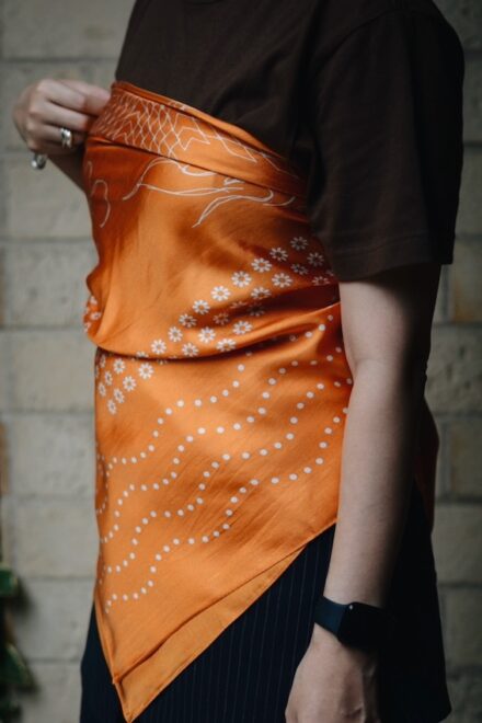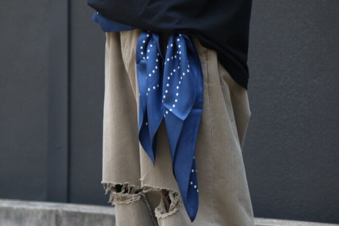 縦横105cmと大判なスカーフのため、肩や頭にかけたり、ベルトループやバッグに結びつけたりは勿論のこと、ベルトとして使用したりと、さまざまなスタイリングでお楽しみいただけます。