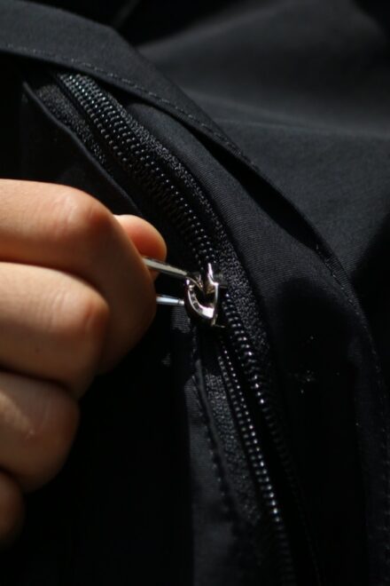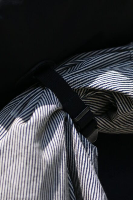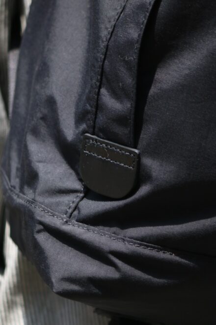 ボトムのレザーストラップは脱いだアウターやシャツを丸めて収納できるようにデザインした簡易的なストラップです。