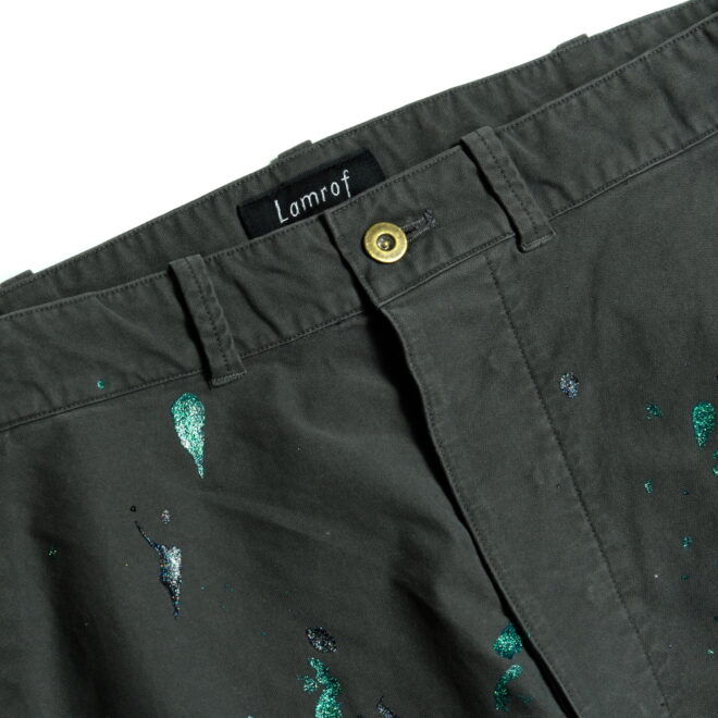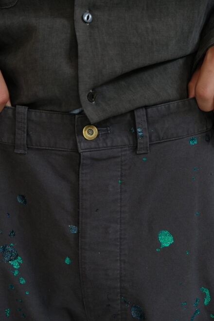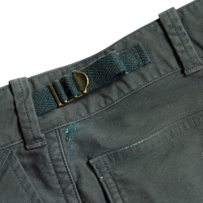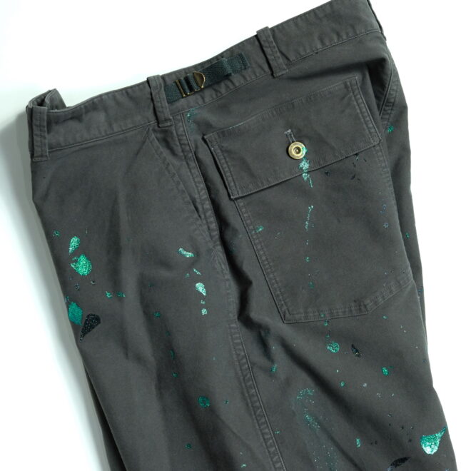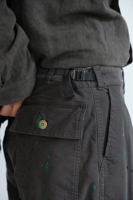 ミリタリーアイテムの位置付けとではなく、絵描きの旅人(Wayfarer)が道中に着ている作業着というイメージで製作した、他にはないファティーグパンツに仕立て上げた一本です。
