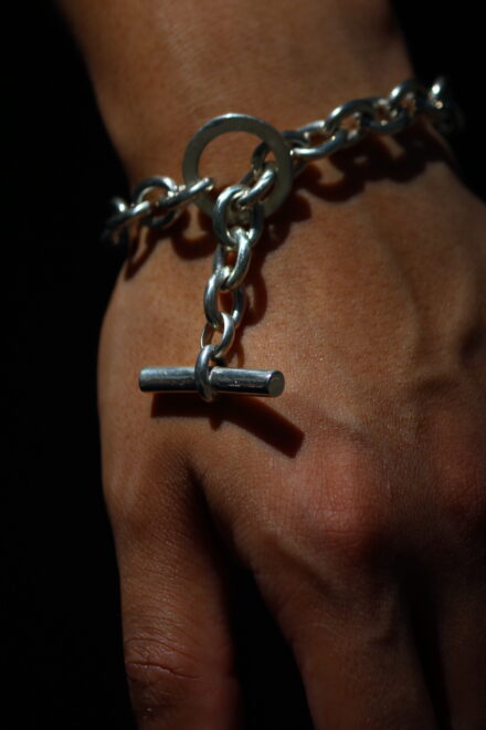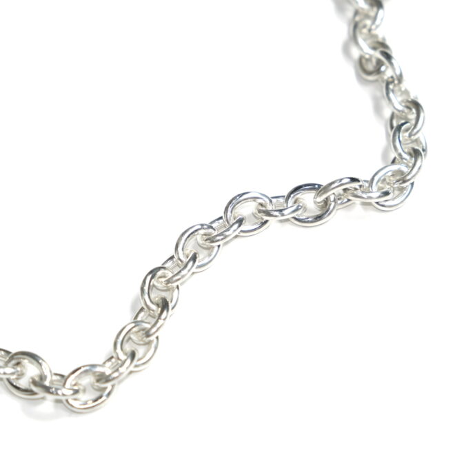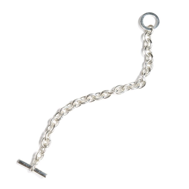 オーバルチェーンにTバーとリングを組み合わせた、無駄のないシンプルな造形美を追求したデザインで、1コマ1コマ全てのロウ付け部分にもバフをかけて、より滑らかに磨き上げられた、量産品では再現できない、職人の丁寧な手仕事が見て取れる美しい仕上げ、本物のシルバージュエリーの素晴らしさをぜひご堪能下さい。