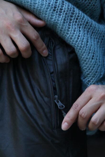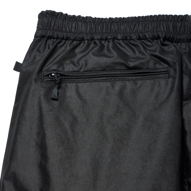 サイドポケット、裾に調整用のジッパーを配し、着脱が容易にできる仕様が施されており、バックはベンチレーション機能を持つバックポケットをデザイン。