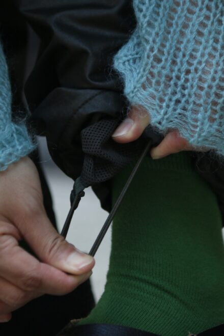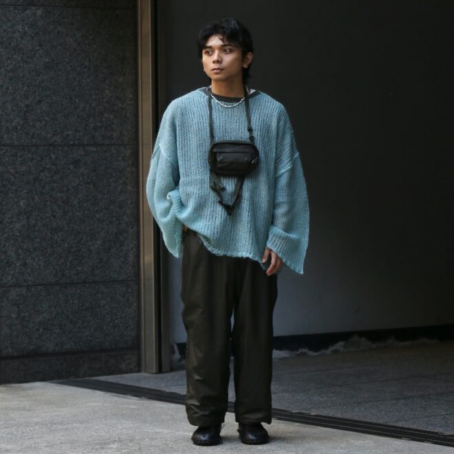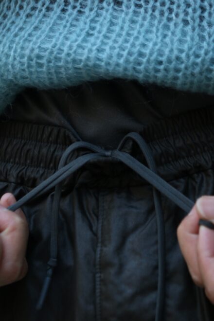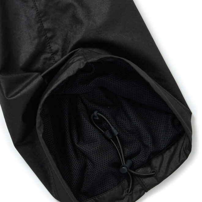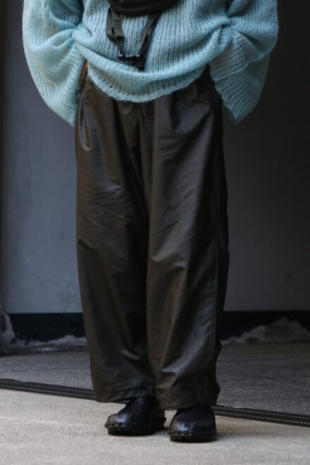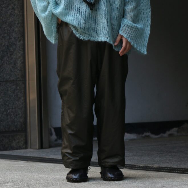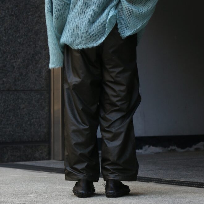 ウィンドブレーカーパンツをオイルドファブリックを彷彿とさせるようなテクニカルな生地にてアレンジ。
