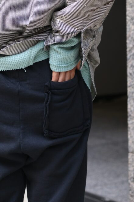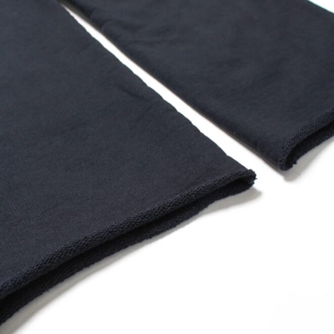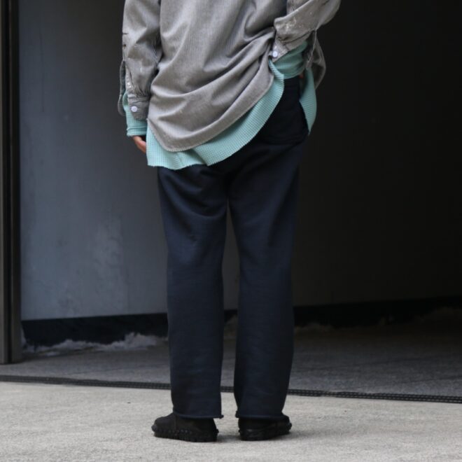 オリジナルのヘヴィーオンス生地に、ゆったりとした股上の綺麗なシルエット、裾口のカットオフディティールによりファッション性を向上。