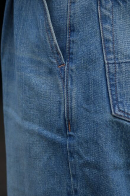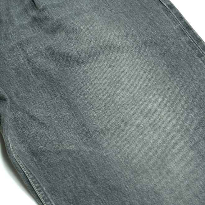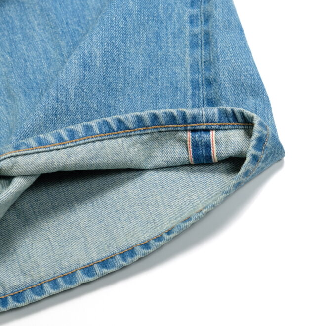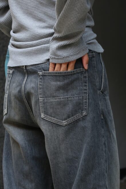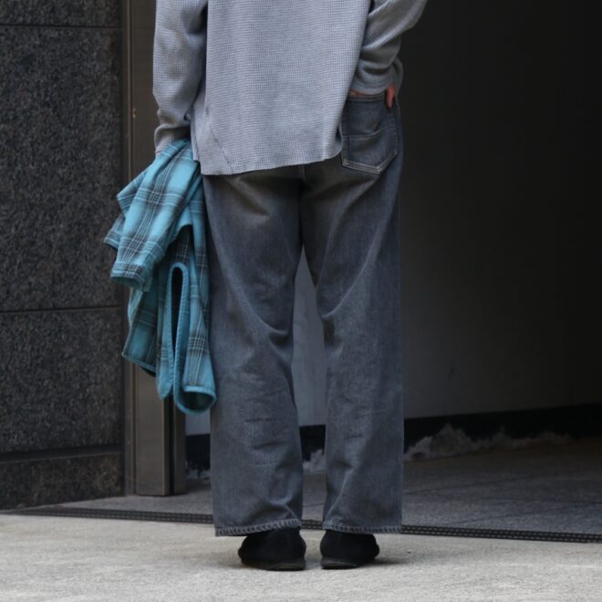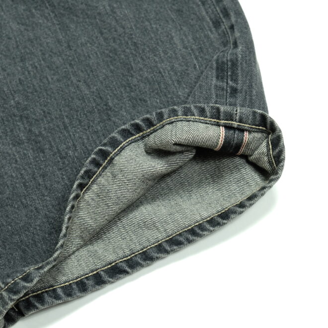 インディゴカラーは定番の金茶ステッチ、MID BLACKはベージュステッチで縫製し、ヒゲブラスト加工、薬擦り、ストーンバイオ、ブリーチ加工、さらにオーバーダイ加工と幾度もの工程を重ね、長年着古したかのような雰囲気に仕上げています。