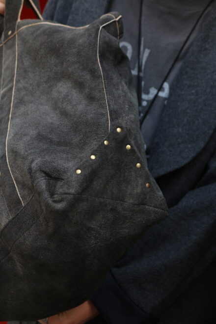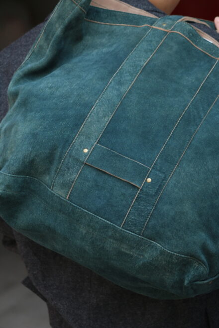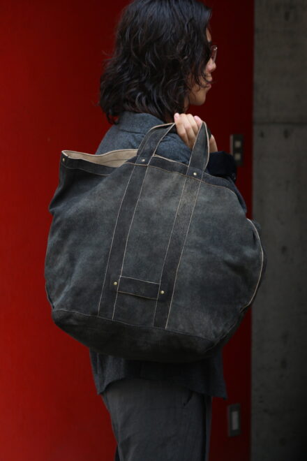 革本来の柔らかさはそのままに、耐久性と耐水性のあるレザー素材の為、中に入れる荷物の分量感で、革のくたり感によって生まれるシルエットの変化も楽しめる仕様になっています。