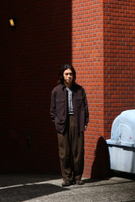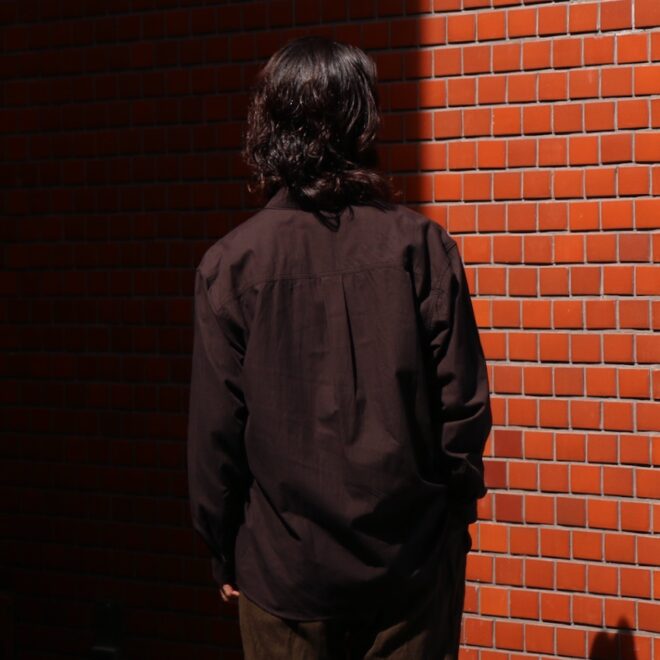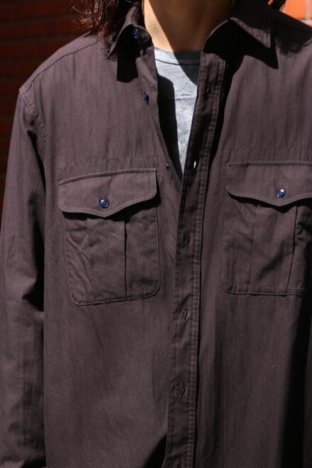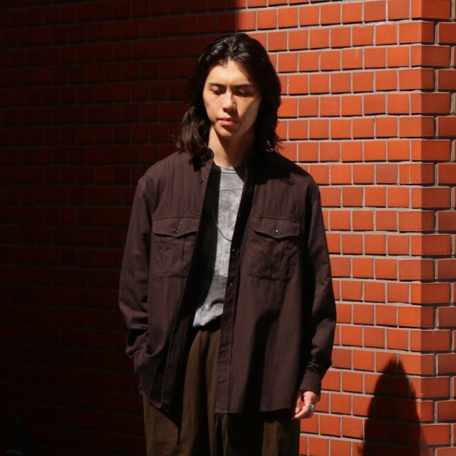 硬くして着ずらいイメージのワークシャツですが、ワークシャツらしい風合いがありながらも、目面の綺麗な素材を強めの縫製仕様で仕上げることで、上品さと風合いの掛け合わさったアイテム。
