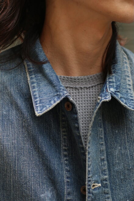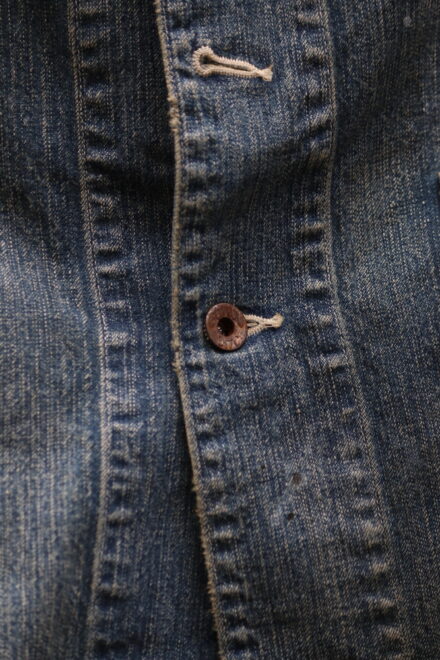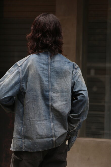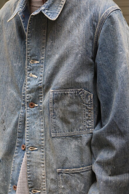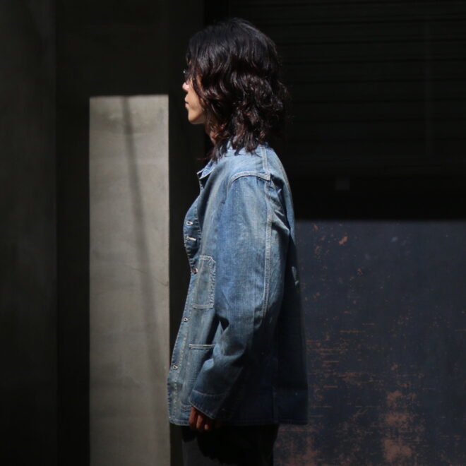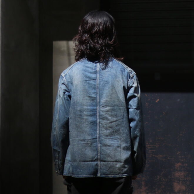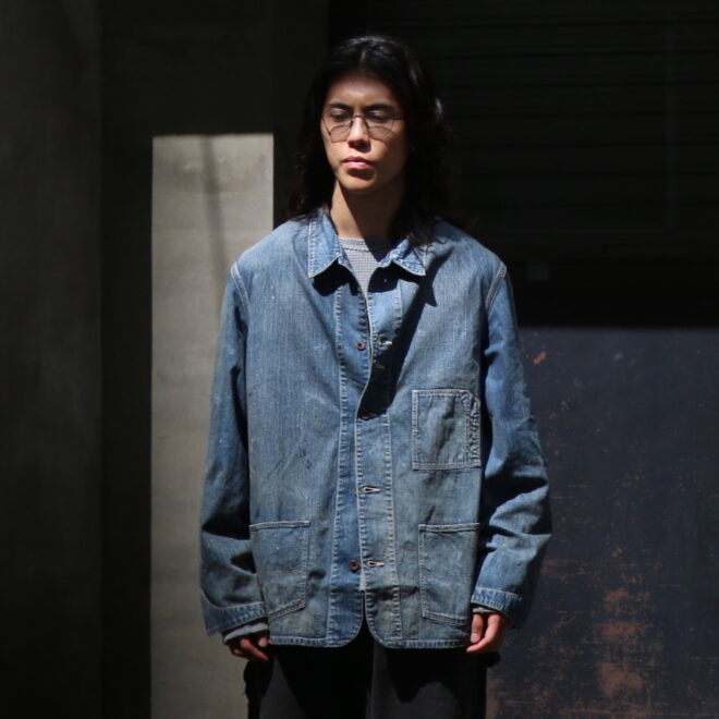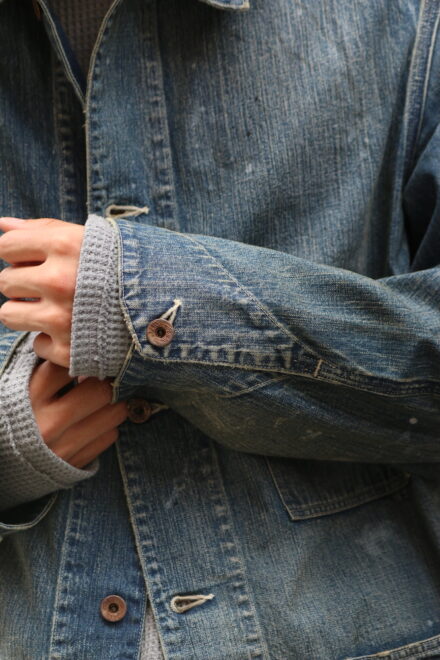 90年代からのヴィンテージ市場で確固たるものとなった30年代を感じさせるワークデニムに、無骨で存在感ある鉄製ワークボタンを採用し、重厚な質感と経年で深まったかの様な加工によるリアルな表情は、当時の作業着が持つ機能美そのものです。