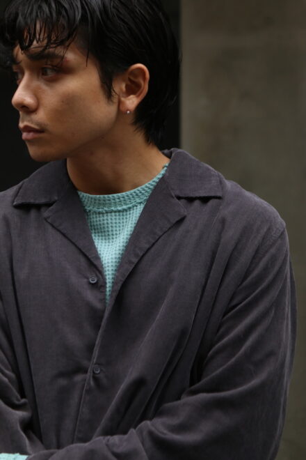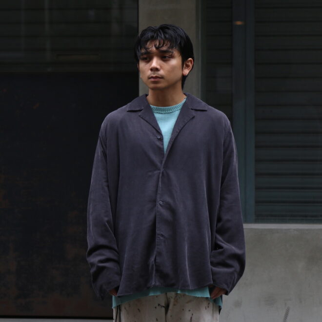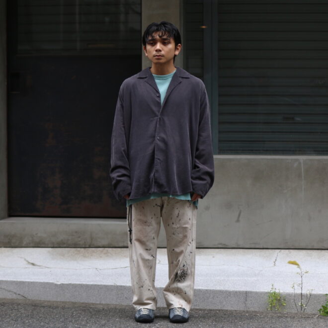 材の特性(落ち感)を生かしたパターン、デザインに落とし込まれ、 レーヨン特有の落ち感と、コットンのナチュラルな風合いがバランス良く落とし込まれた1着になります。