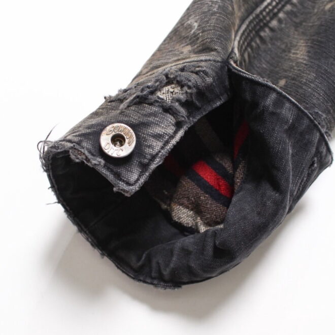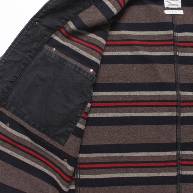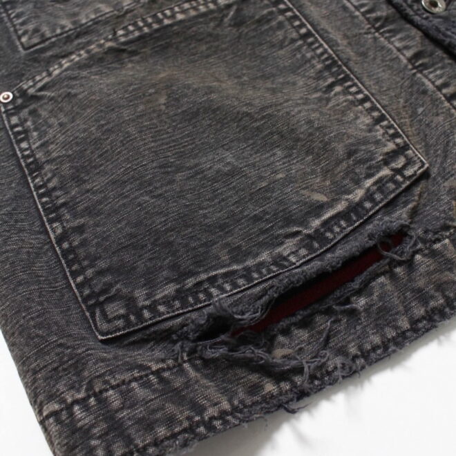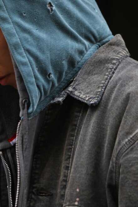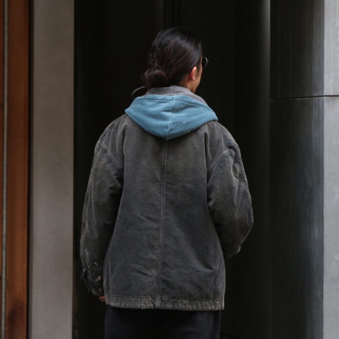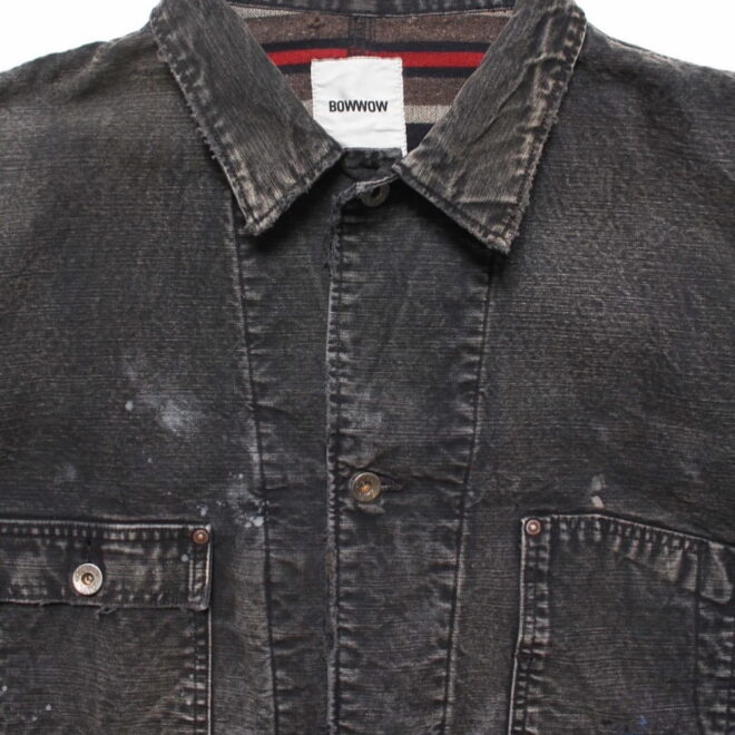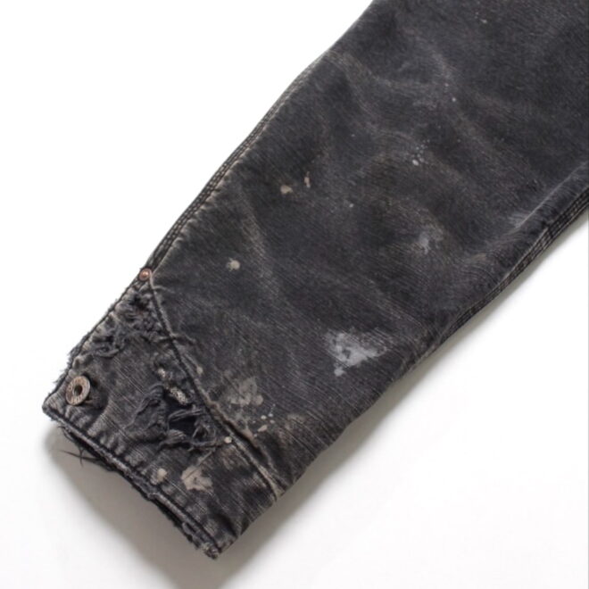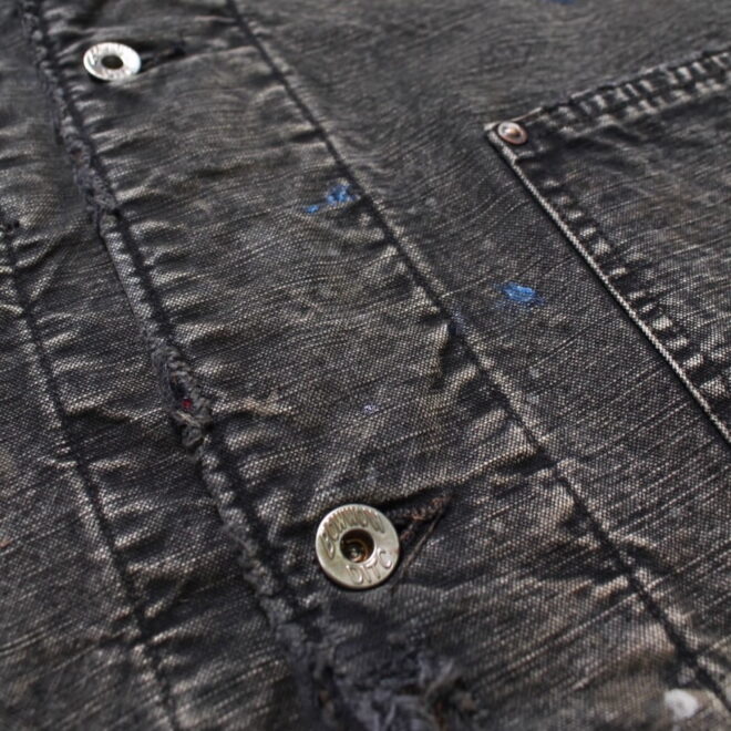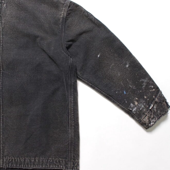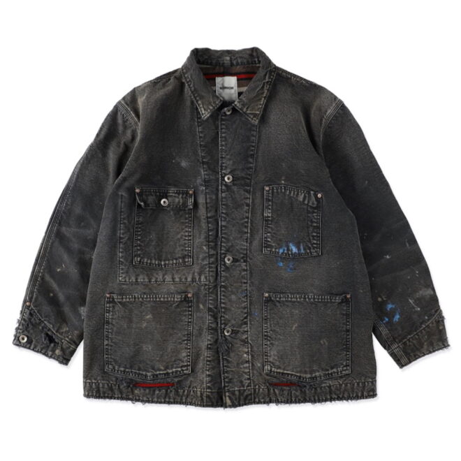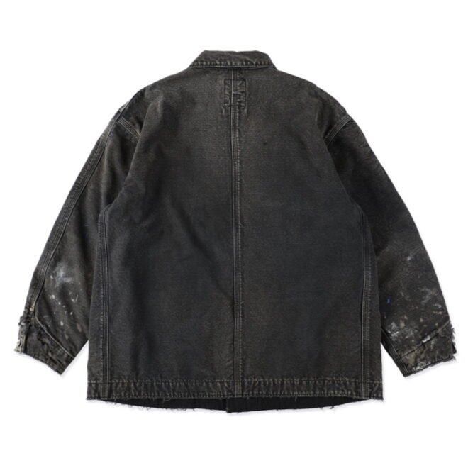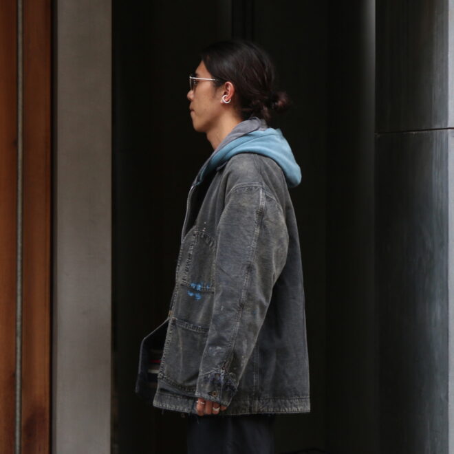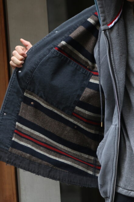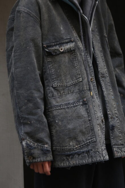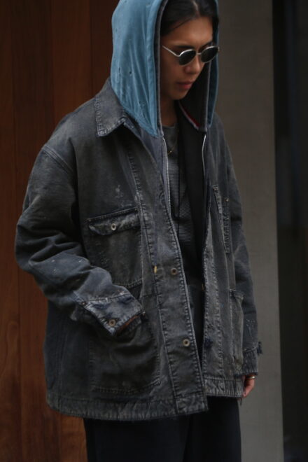 身頃にはヘビーオンスのダック地を、裏地には温もりのブランケットを配し、日々の作業で知らぬ間に付いたペンキ跡や擦れ、味わい深い破れを加工で再現。