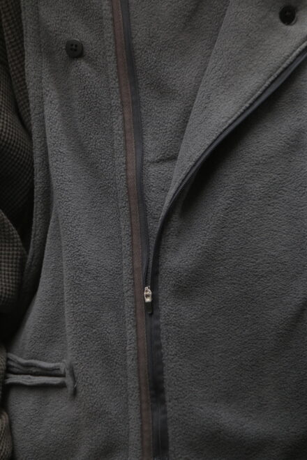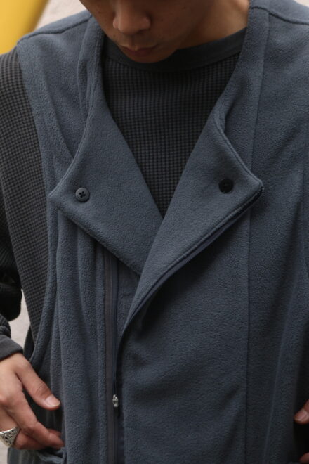 アームホール、身幅は広くデザインされ、前立てはダブル仕様で襟を折ったりジップを閉めたりとアレンジしスタイリングをお楽しみ頂けます。