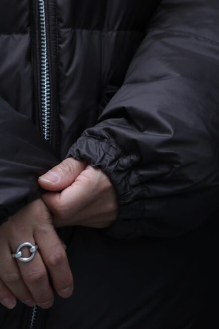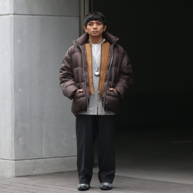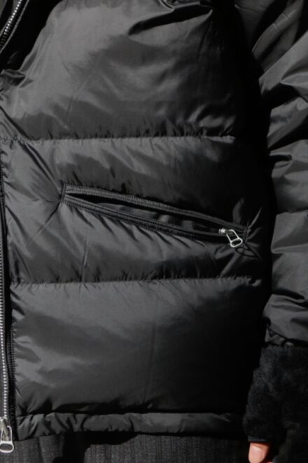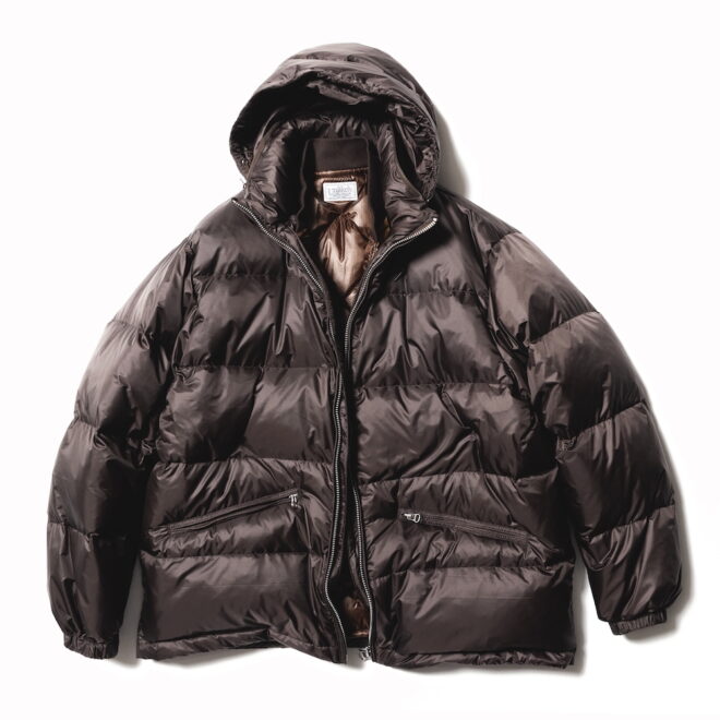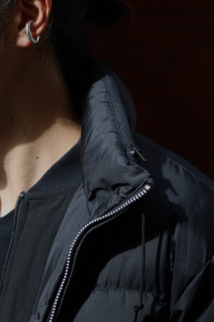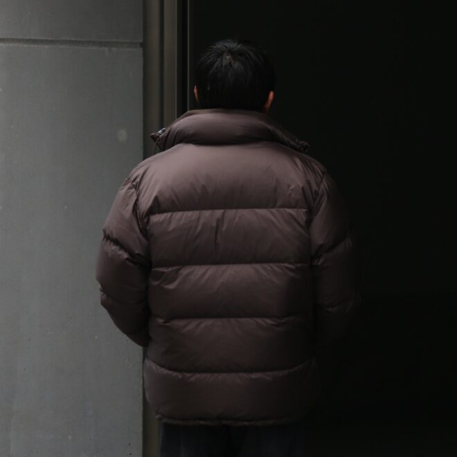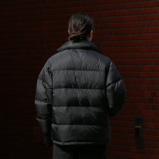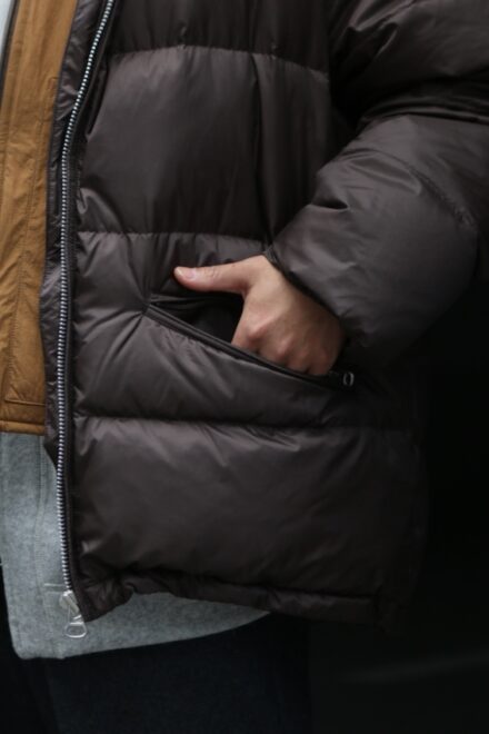 光沢のあるナイロンが非常に上品で、着膨れしてしまいがちなアイテムですが、ボリューム感も程よく軽い。