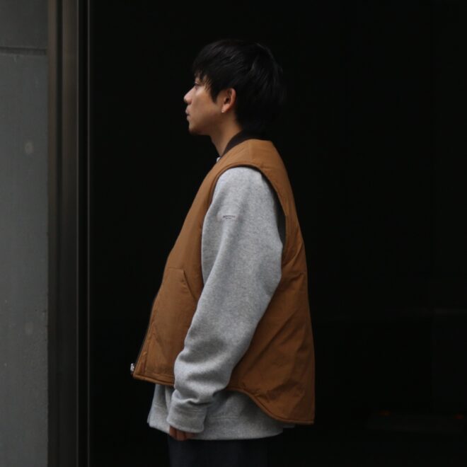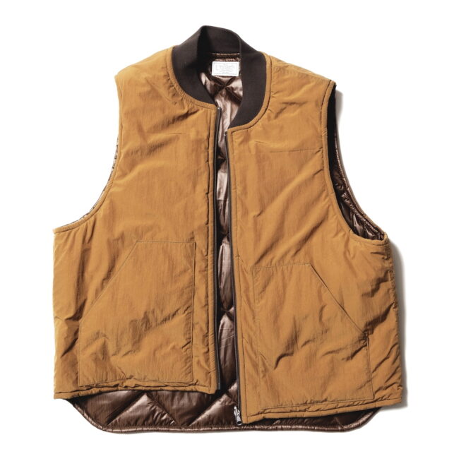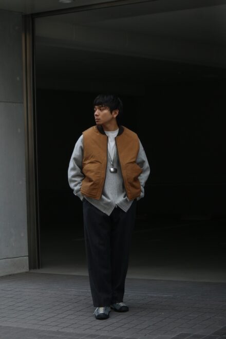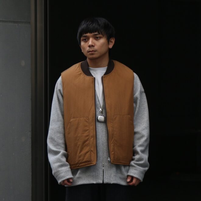 ベストはワークベストをモチーフにしたリバーシブルのデザイン。