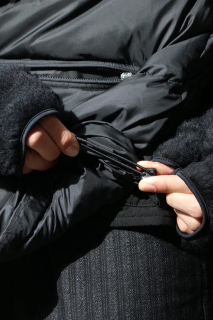 ダウンジャケットはシンプルなクラシカルなデザインとなっておりますが、収納可能なフードに静電気を抑える役割のある制電糸を打ち込んだ特殊な超軽量ナイロン。