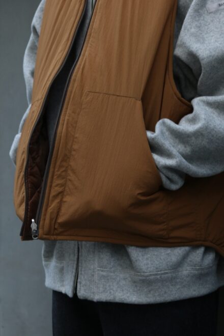 PRIMALOFTを使用しており、表面は極細番手のナイロンを高密度に織り上げ、且つ特殊な揉み込みワッシャーを施し、適度なユーズド感が感じられるナイロン表地。