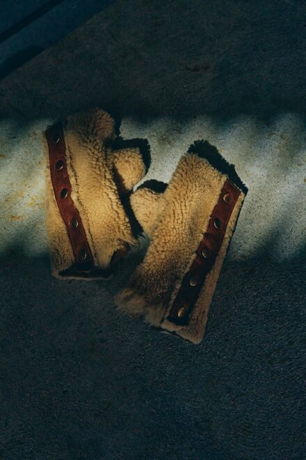 あえてスウェード面をラフに仕上げ、ナチュラルエッジはカットせずにそのまま鞣し、毛面はカールさせる事で上質ですが、上品ではないアメリカのムートンのような雰囲気で仕上げて頂いております。