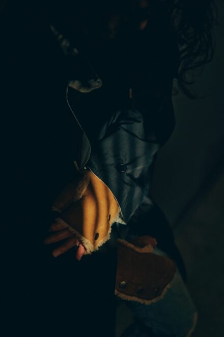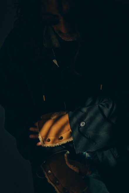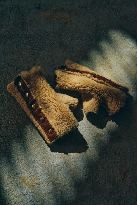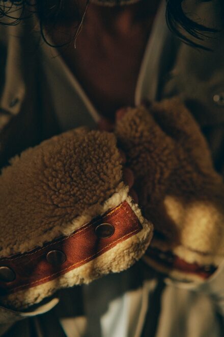 スマホもそのままお使い頂けるよう指なし仕様にし、袖口は元々のムートンが持つナチュラルエッジをデザインとして落とし込んでおりますので、どれも全く同じ物が存在しない完全なる一点物になります。