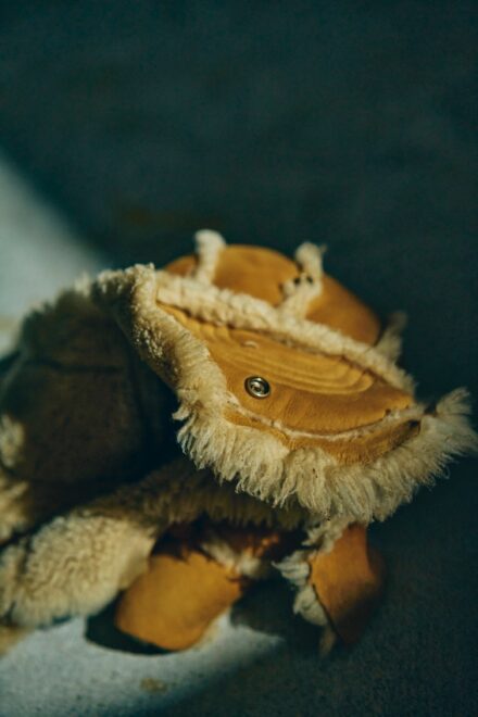 ボリュームあるシルエットに隠しポケット2つを装備し、耳当てやフラップ、ツバは元々のムートンが持つナチュラルエッジをデザインとして落とし込んでおりますので、どれも全く同じ物が存在しない完全なる一点物になります。