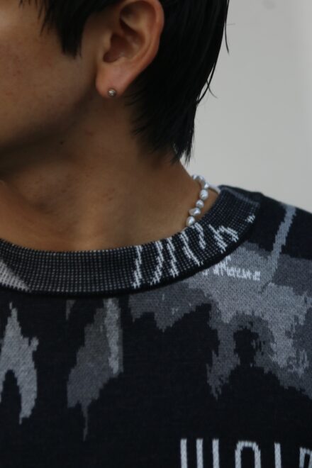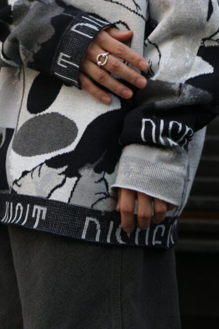 柄の配置にこだわり、袖や襟のリブ部分までモチーフが連続する緻密なデザイン。