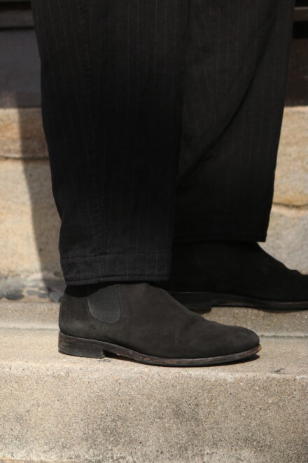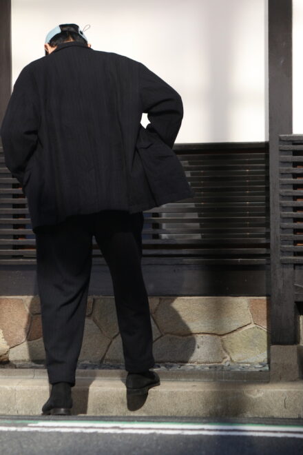 生地、シルエット、同色調のストライプ、どれも着飾りすぎず、抜きすぎない絶妙な塩梅は、どこか余裕のある着こなしを演出してくれます。
