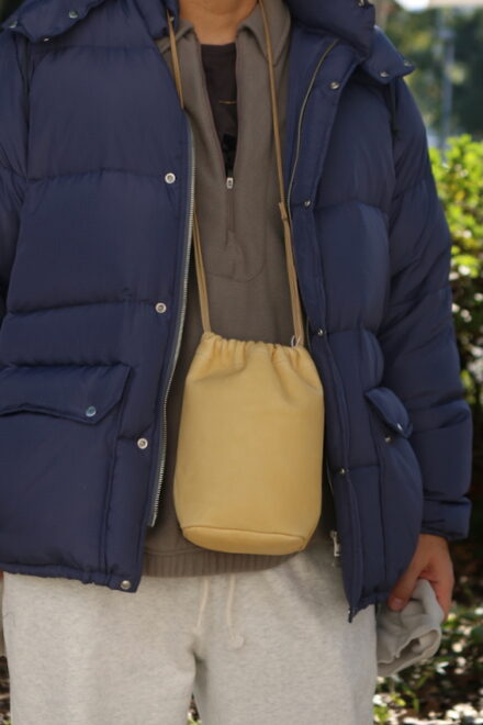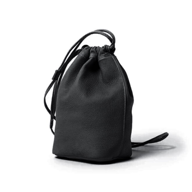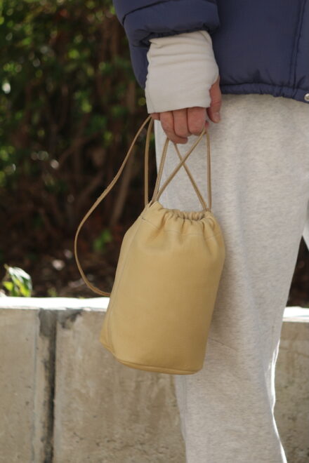 手下げと肩掛けと2WAY仕様で、両サイドのコードを絞るとボディ全体が錐形になるドローストリングポーチになります。