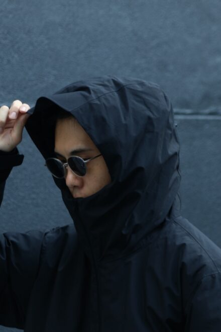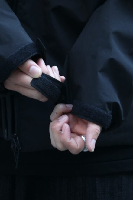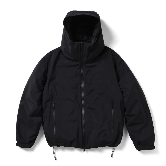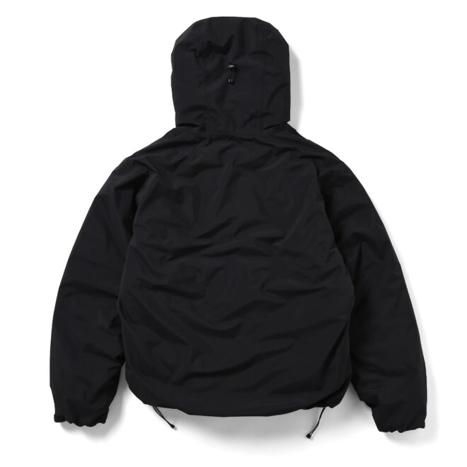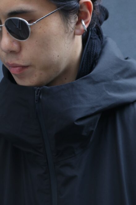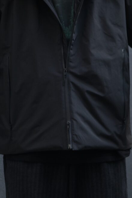 ネックは口元を覆うほどの高さがあり、袖口はテープで調整可、フロントのダブルジップに裾はドローコード付きと、生地・デザイン共に機能的でシックな仕上がりとなっています。