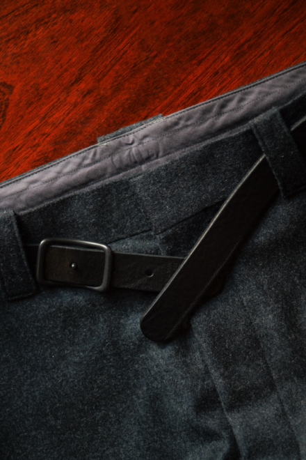 またバックルが通しやすく、且つ革の伸びを軽減する雫型のベルトホールや、ステッチ部分を手縫いで仕上げ、革の厚みを利用してボトムスを痛めないよう裏面にパーツを出さない配慮など、角本さんの想いの詰まった拘りよう。