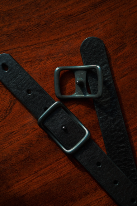 ロウを含んだ堅牢で品格のあるイギリス製のレザーをナローベルトに落とし込み、昔ながらの真鍮の板を曲げて作られるパーツも、デザイナー・角本さんが探し求めていたモノで、銅と亜鉛の混合が国内のものとは異なるイギリス製のものに近い風合い。