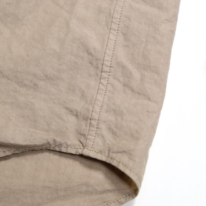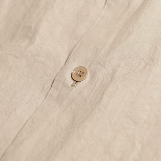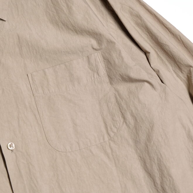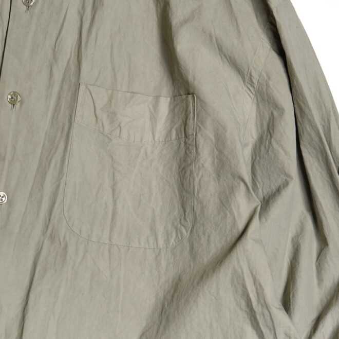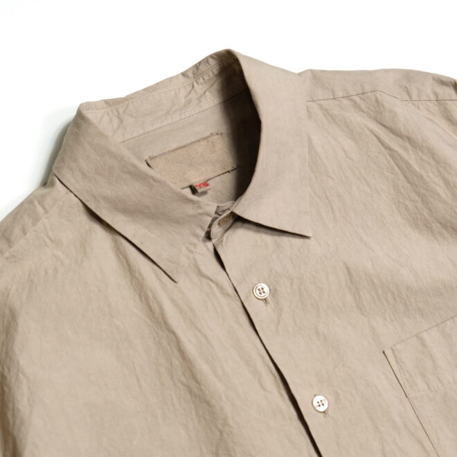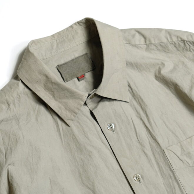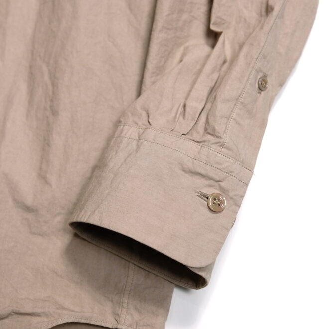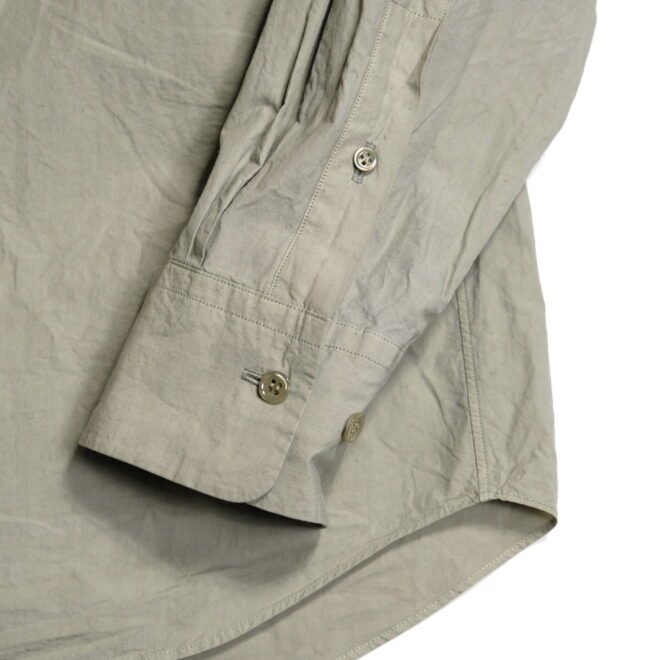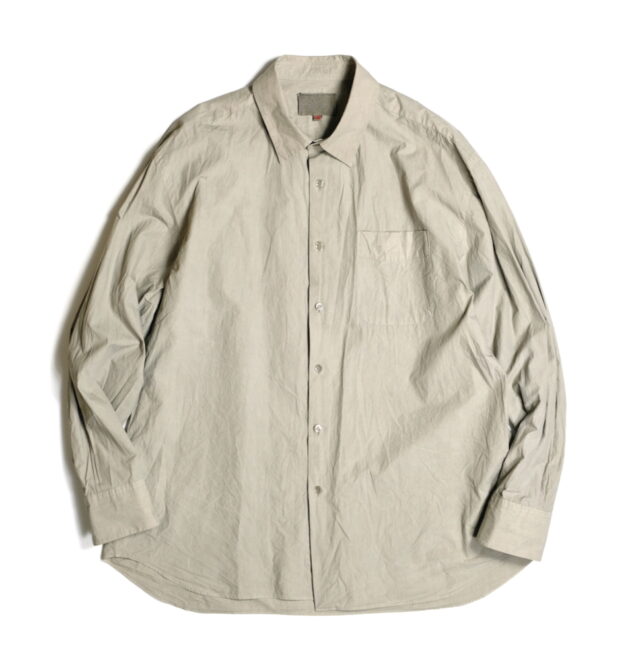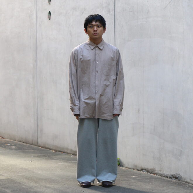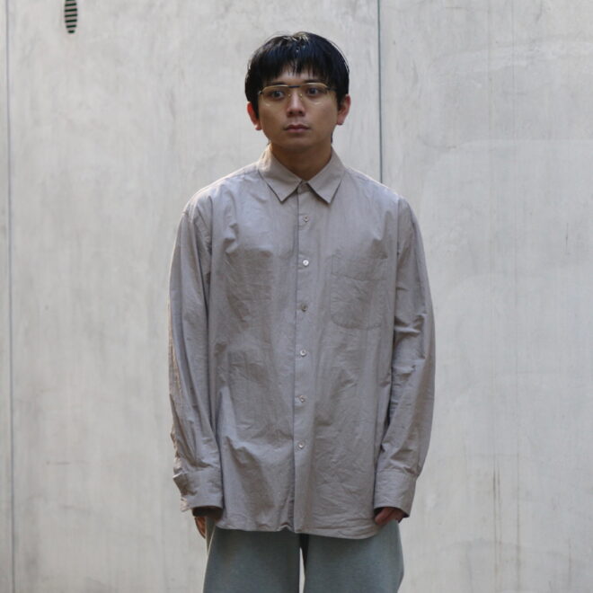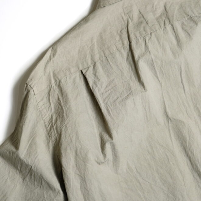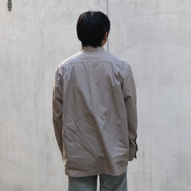 ドレスシャツらしい上品なパターンメイキングで有りながら、程よくドロップしたショルダーライン、ゆったりと広い身幅、力の抜けたルーズなサイズ感が特徴。