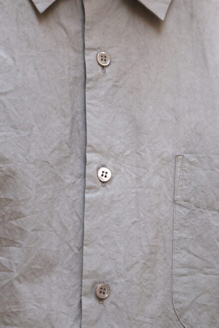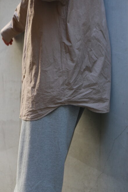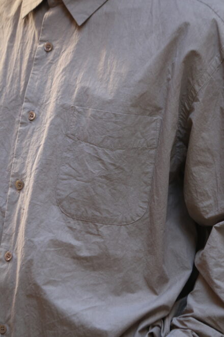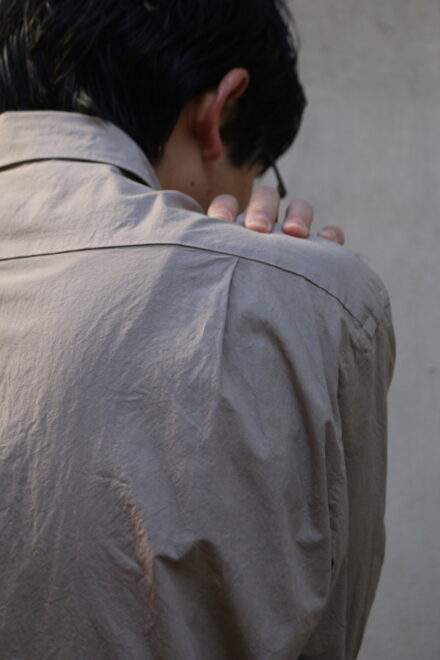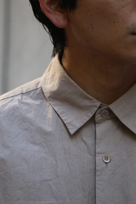 ドレスシャツらしい上品なパターンメイキングで有りながら、程よくドロップしたショルダーライン、ゆったりと広い身幅、力の抜けたルーズなサイズ感が特徴。