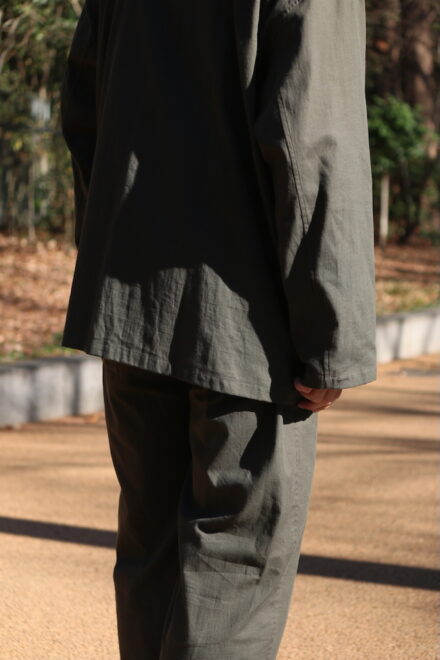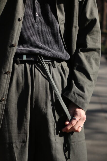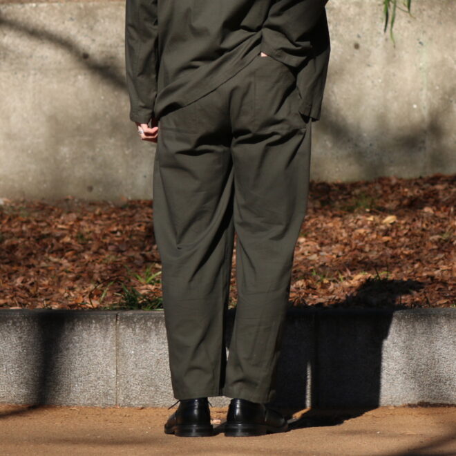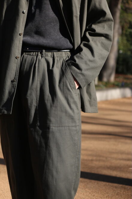 セットアップとしてデザインされたイージーパンツは、ポケットをベイカーパンツの仕様を採用することで、シャツと同様に軽快な素材感に対して程よいデザインを施されています。