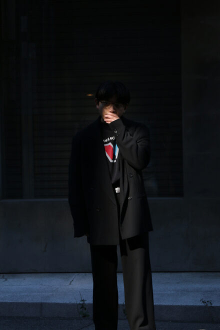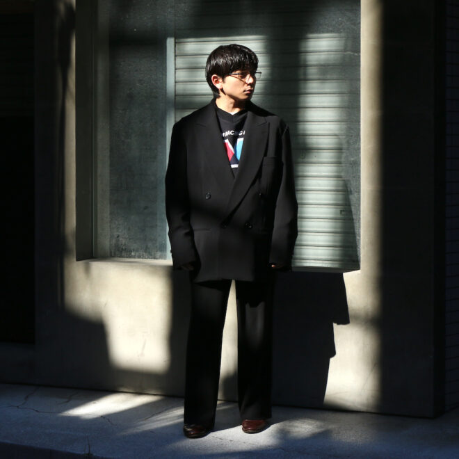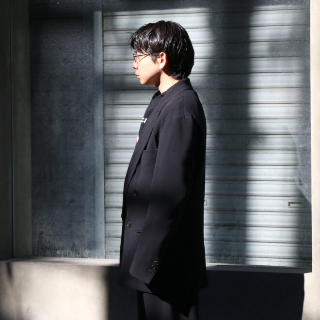 ドレープ感の強い素材を採用し、サイジングもゆったりとさせながらもかなり収まりの良いシルエットに。