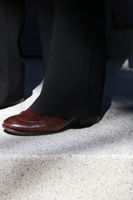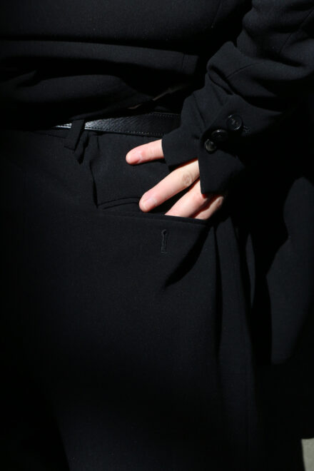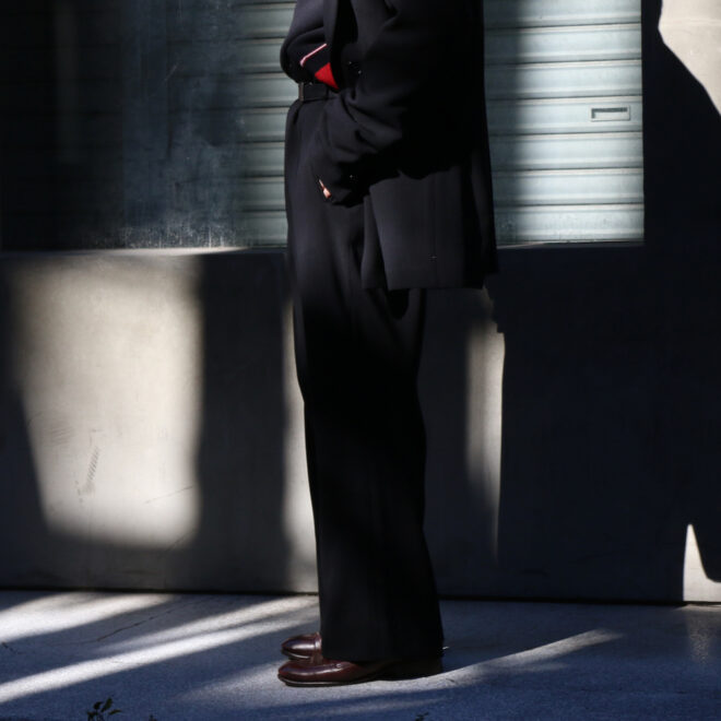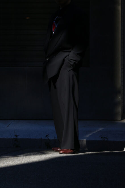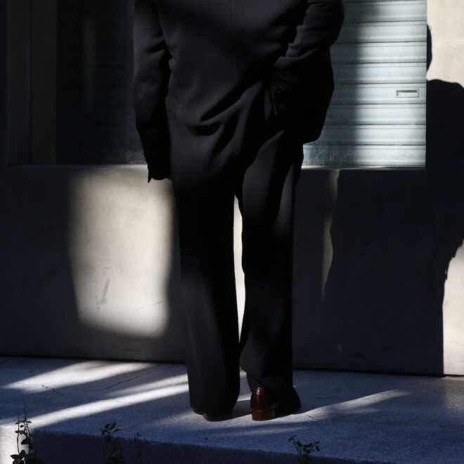 パンツはゆったりとしたドレープ感があり、毛芯を入れ、手作業で、丸みや立体感があり、歩いた時の生地の揺れを感じて頂けます。