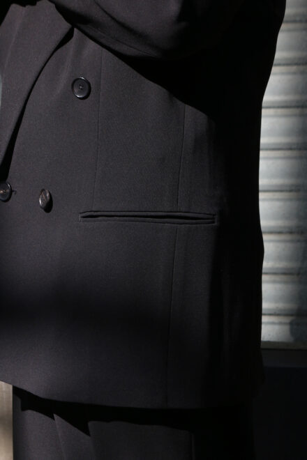 トリアセテートを使っているため、ドレープ感があり、毛芯を入れ、歩いた時の生地の揺れを感じ、柔らかく、とても着心地の良いアイテムとなっております。