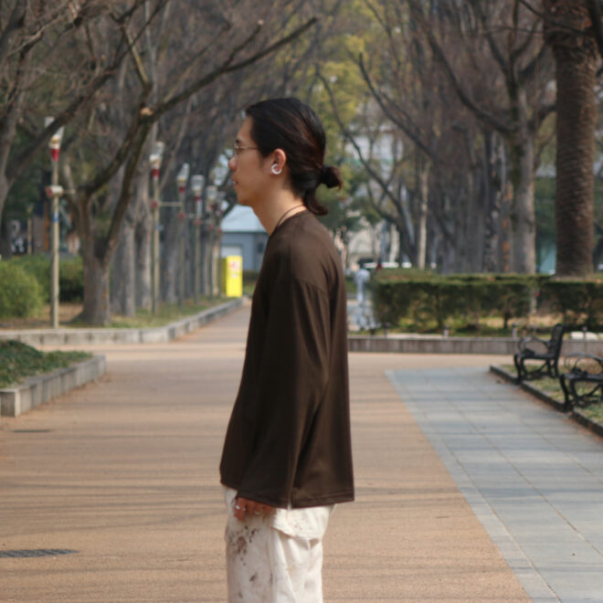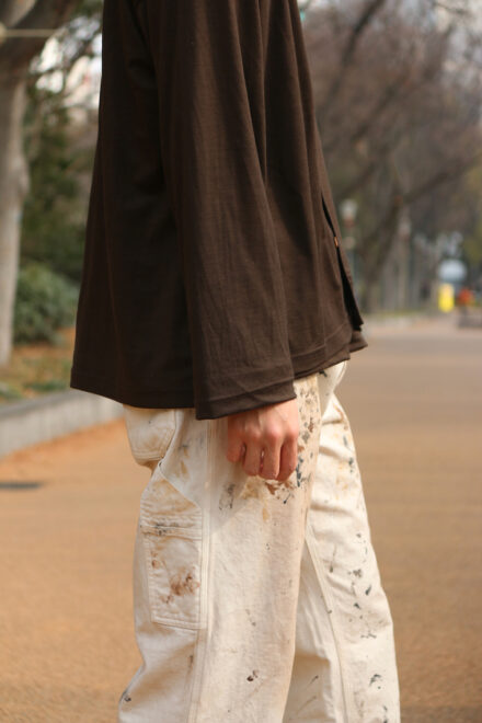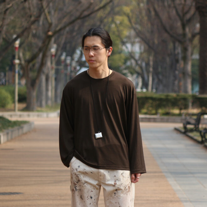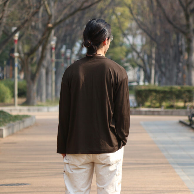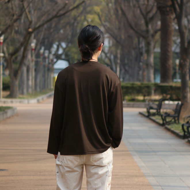 適度にゆとりのあるサイズ感に設計しており、アームから袖口幅は身幅に比べるとやや多く分量を取っているので、生地自体の落ち感と相まって、スポーティさとラグジュアリーな要素をを両方纏った雰囲気に仕上がっています。