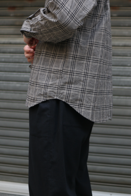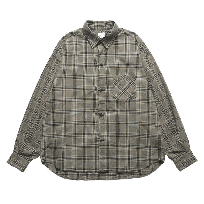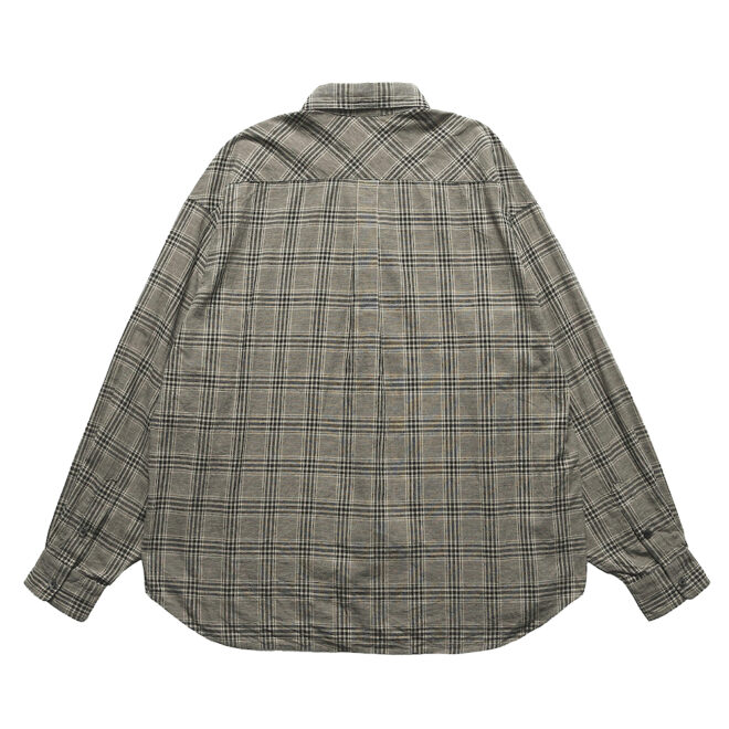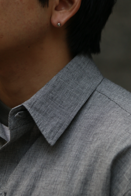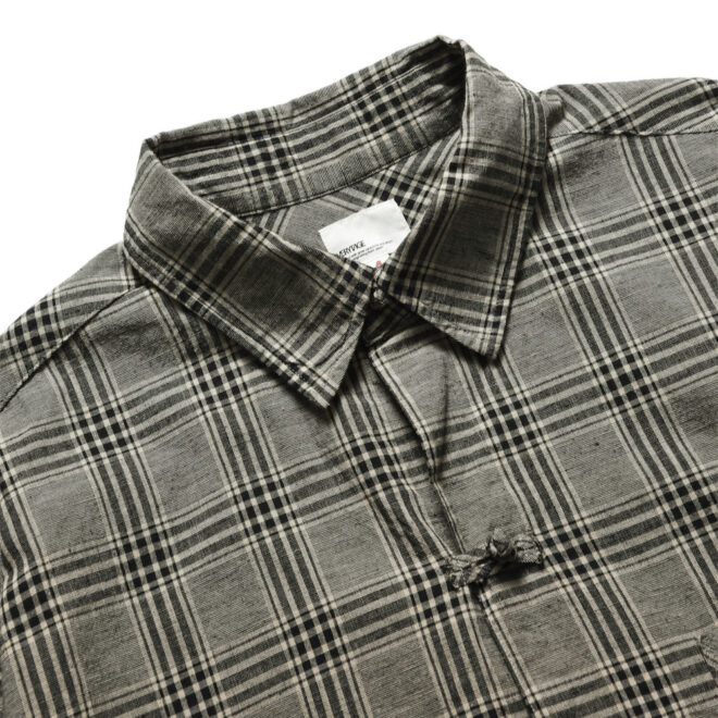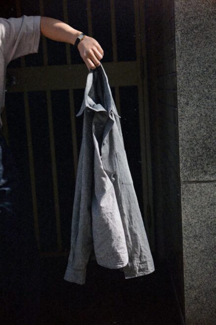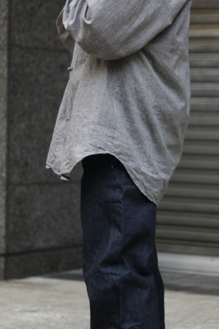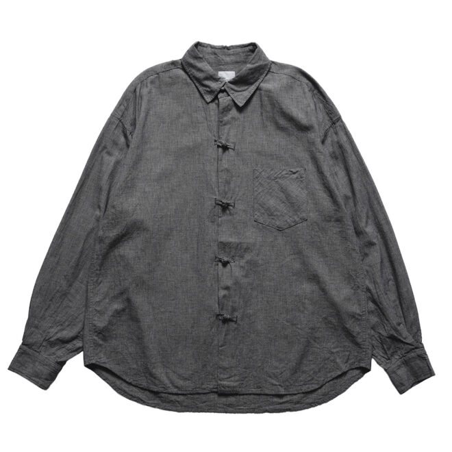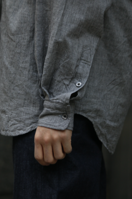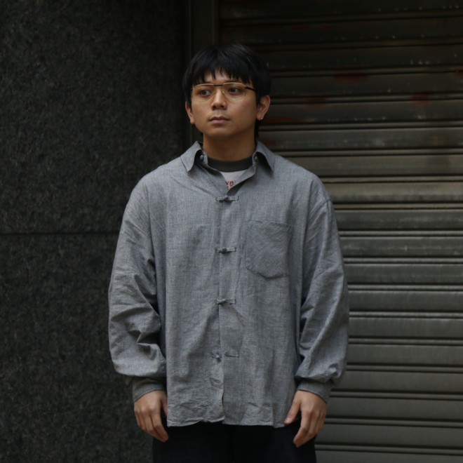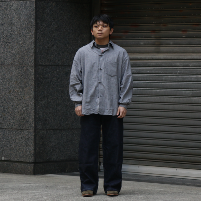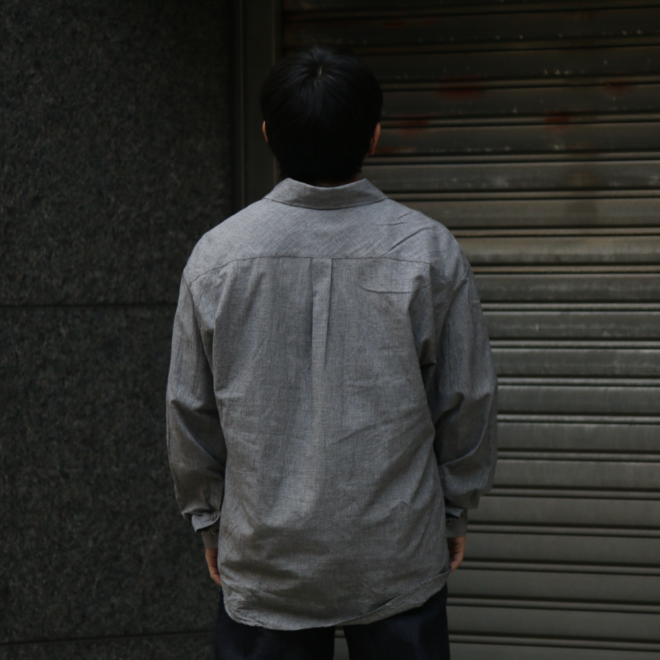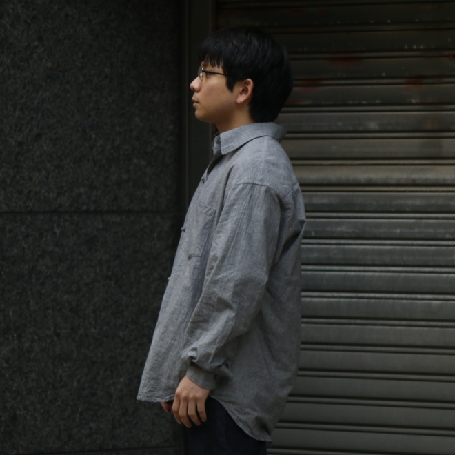ノーカラーやスタンドカラーが多いミリタリーシャツの中でも、最もベーシックな形を採用することで、どんなスタイリングにも馴染みやすく仕上げています。