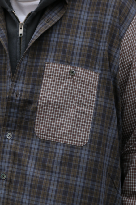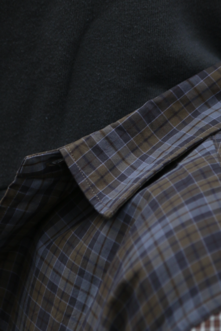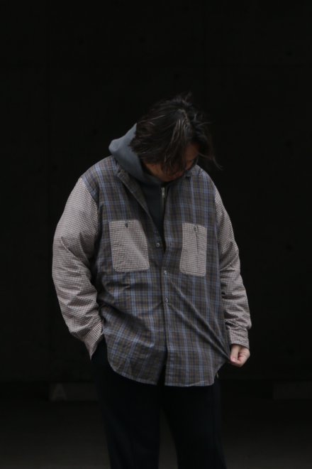 Fabric:細番手の糸を高密度に織り上げた、オリジナルのタイプライター生地を使用。 高密度でありながら、超長綿を使用することで、しなやかで上品な風合いに仕上げています。ヴィンテージのシャツ柄を参考に、細かなカラーバランスを調整したオリジナルチェック柄は、ヴィンテージ感のある雰囲気を醸し出します。