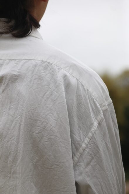 シルクのようなしなやかさとドレープ感がポイントで、肩の力が抜けたリラックスシルエットと計算された短めの着丈です。